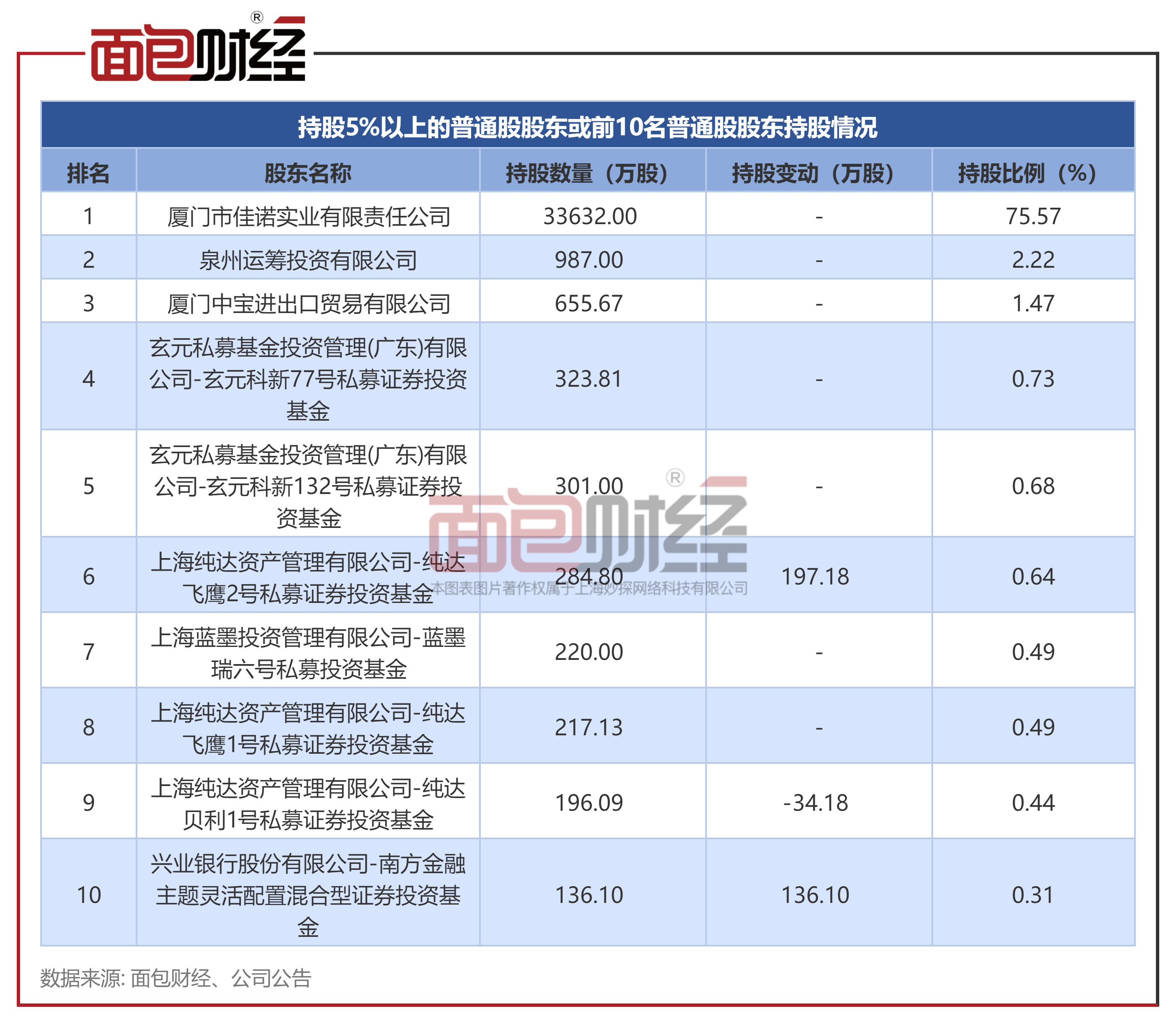 其中,上海纯达资产管理有限公司中的纯达贝利1号私募证券投资基金持股数量有所下降,报告期内减持34.18万股,减持后持股数量为196.09万股;该公司另一产品,纯达飞鹰2号私募证券投资基金在报告期内增持197.18万股。