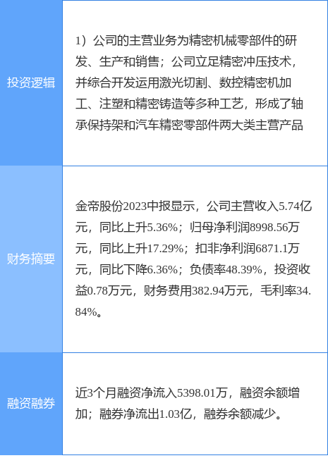 金帝股份涨停收盘,收盘价36.74元。该股于9点31分涨停,2次打开涨停,截止收盘封单资金为1.05亿元,占其流通市值5.81%。