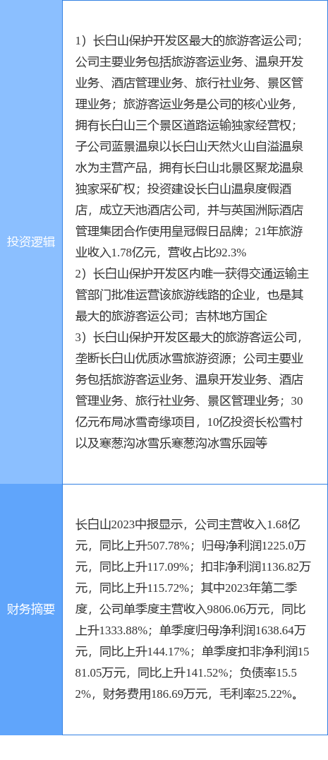 长白山涨停收盘,收盘价15.09元。该股于9点38分涨停,1次打开涨停,截止收盘封单资金为2977.12万元,占其流通市值0.74%。