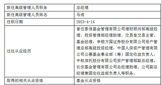 值得注意的是,我们观察发现,长安基金的上任总经理马成的任职时间很短。根据长安基金公告,2023年4月14日,公司总经理汪钦因个人原因从公司离职,副总经理马成被任命为公司新任总经理。