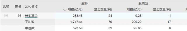 根据wind数据显示,截至2023年二季度末,公募市场规模平均数为1747.44亿元,中位数为523.59亿元,长安基金的公募规模要远远低于行业中位数,在全市场155家公募产品管理机构中,规模排名在98位。