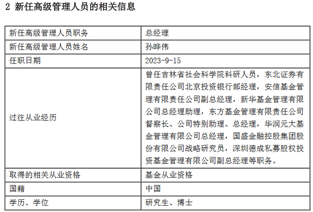 资料显示,孙晔伟具有丰富的基金行业从业经验,曾在安信基金、新华基金、东方基金、华润元大基金等担任高管,曾出任过东方基金、华润元大基金的总经理。