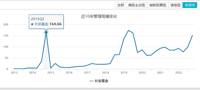特别是长安基金的非货币基金规模波动比较大。Wind数据显示,近10年来,长安基金的非货币规模在2015年二季度末达到164.66亿元,而随后的2015年三季度变下滑至4.02亿元,此后在2019年末非货币规模又达到173.24亿元的巅峰,随后又开始了跌破100亿元,在2023年二季度又再次达到150.13亿元。