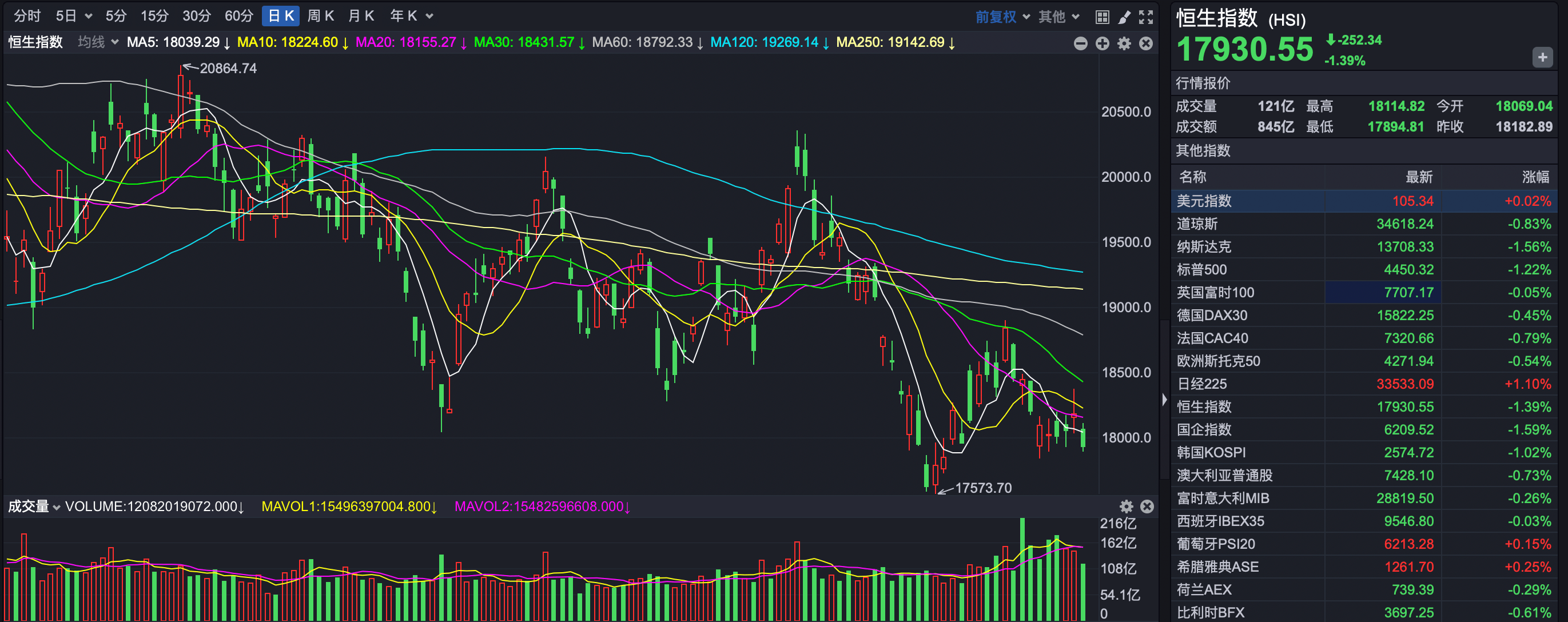 9月18日,港股市场延续上周以来的跌势,恒生指数失守一万八关口。截至收盘,恒生指数下跌252.34点,以17930.55点报收,跌幅1.39%;恒生科技指数下跌90.56点,以3987.35点报收,跌幅2.22%。