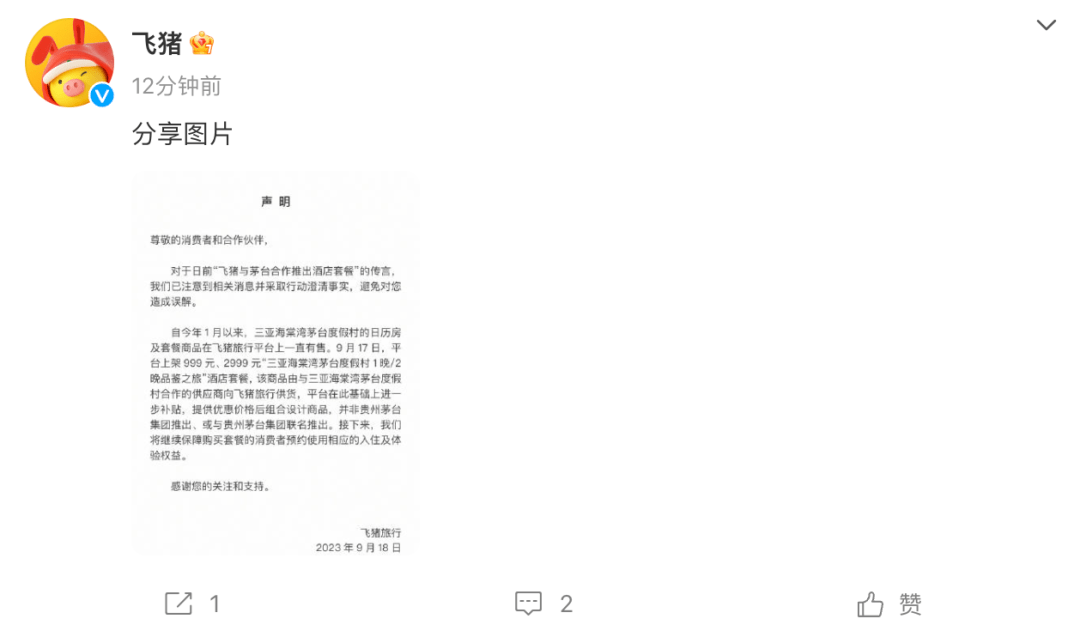 飞猪称,自今年1月以来,三亚海棠湾茅台度假村的日历房及套餐商品在飞猪旅行平台上一直有售。9 月17日,平台上架 999 元、2999 元“三亚海棠湾茅台度假村 1晚/2晚品鉴之旅”酒店套餐,该商品由与三亚海棠湾茅台度假村合作的供应商向飞猪旅行供货,平台在此基础上进一步补贴,提供优惠价格后组合设计商品。