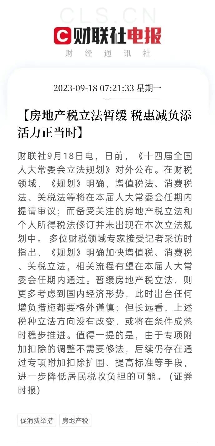 刚刚,财联社发布消息称,日前《十四届全国人大常委会立法规划》对外公布,备受关注的房地产税立法和个人所得税法修订并未出现在本次立法规划中。