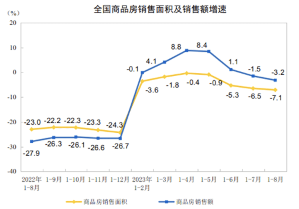 第二,房地产投资持续下降。1至8月份,全国房地产开发投资76900亿元,同比下降8.8%;其中,住宅投资58425亿元,下降8.0%。