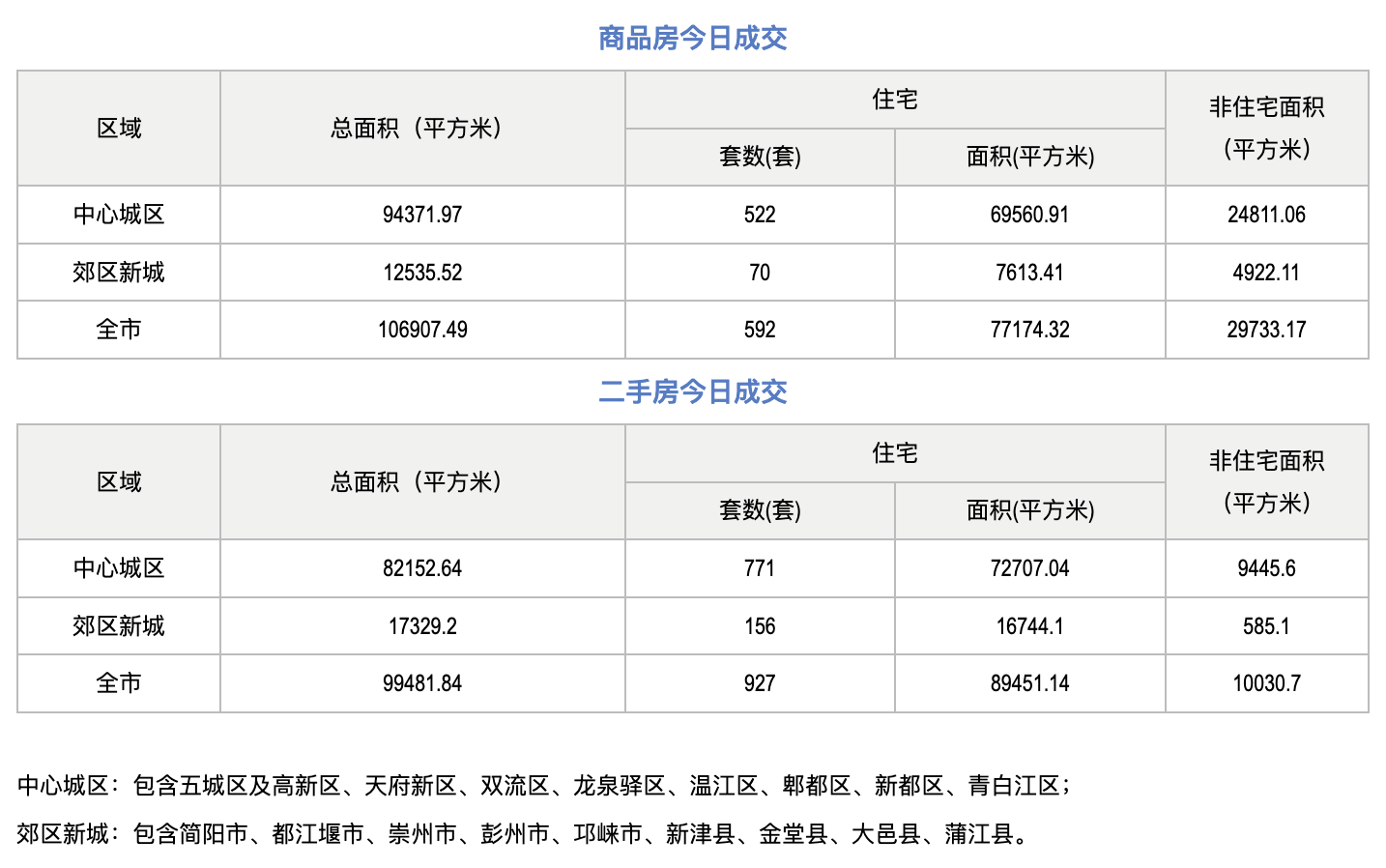 据成都市住建局住建蓉e办数据显示,2023年9月18日,成都市全市商品房成交(备案)总面积106907.49平方米;其中商品住宅成交(备案)592套,商品住宅成交(备案)面积77174.32平方米。二手房成交(备案)总面积99481.84平方米,其中二手住宅成交备案927套,二手住宅成交(备案)面积89451.14平方米。
