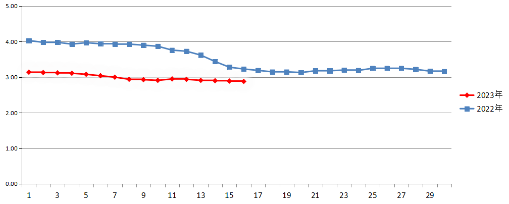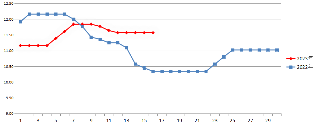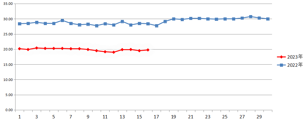 2023年9月与2022年同期白条猪平均价走势对比图