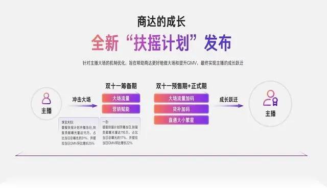 此外,快手电商同时发布“扶摇计划”,针对主播大场进行机制优化,帮助商家更好的做大场和提升GMV,最终助力主播的成长跃迁;通过流量,营销,补贴等多方面机制优化,在大场的不同阶段(前、中、后),结合主播货盘、商业化投入等信号给予主播确定性的大场流量分配机制。