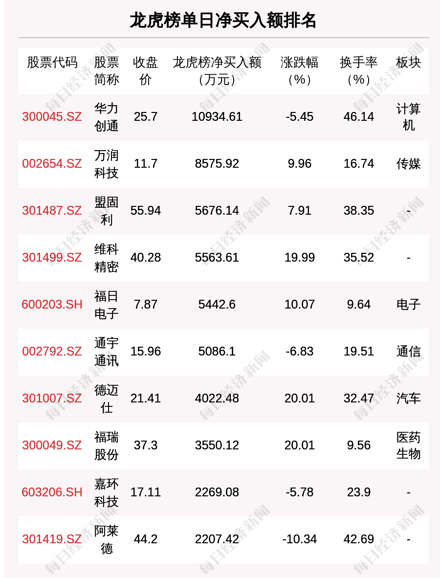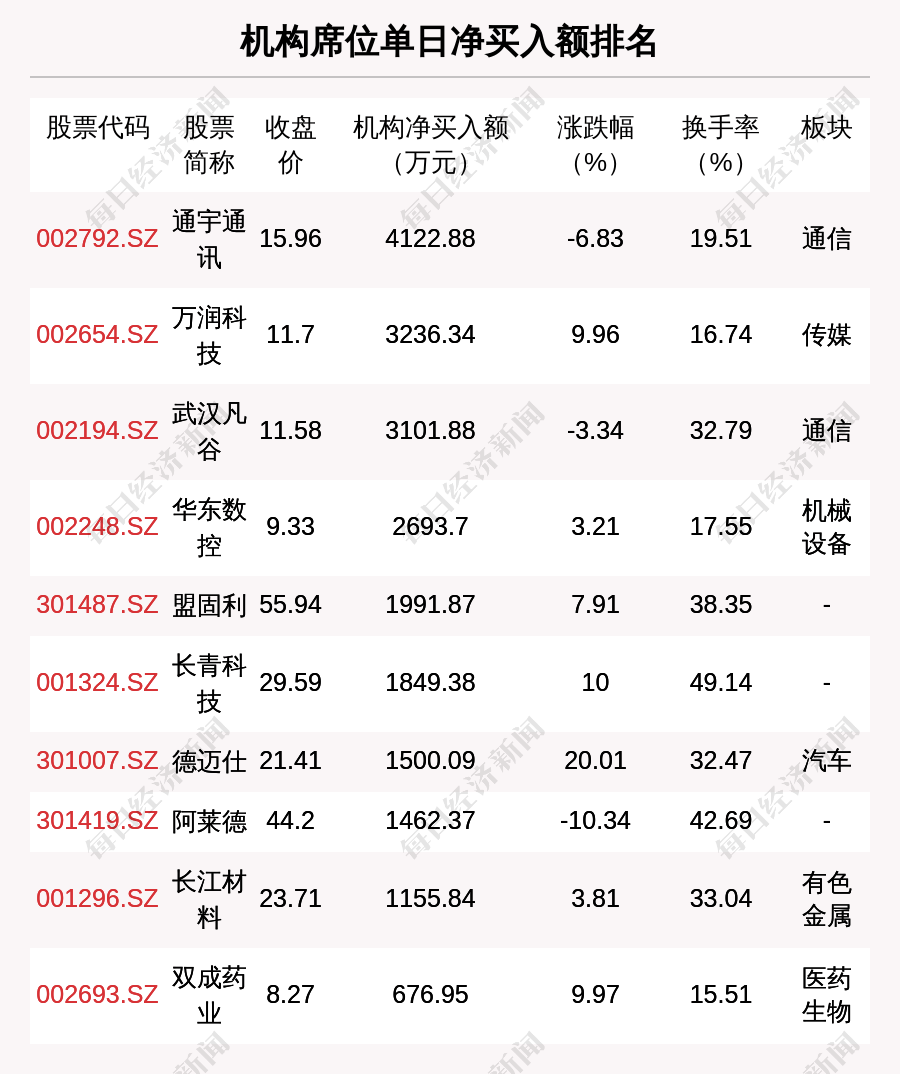 在龙虎榜中,涉及机构专用席位的个股有23只,净买入额前三的是通宇通讯、万润科技、武汉凡谷,分别为4122.88万元、3236.34万元、3101.88万元。