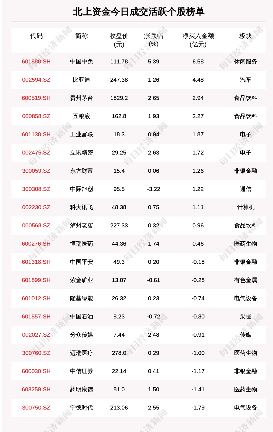 9月18日,北上资金成交活跃个股榜单中,净买入个股共11只,金额最多的是中国中免(601888.SH,收盘价:111.78元),净买入6.575亿元;净卖出个股共9只,金额最多的是宁德时代(300750.SZ,收盘价:213.06元),净卖出1.788亿元。