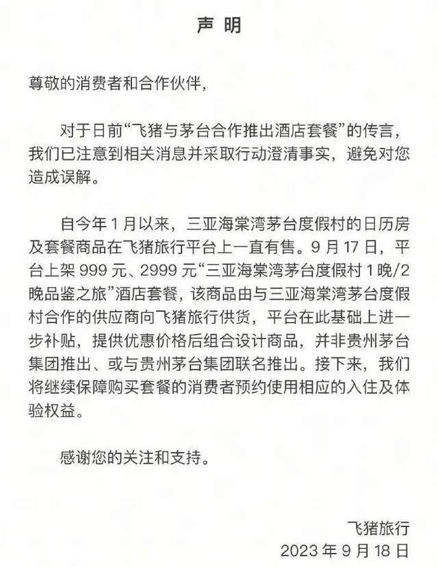 9月18日中午,飞猪官方发布声明,核心要点是“该商品由与三亚海棠湾茅台度假村合作的供应商向飞猪旅行供货,平台在此基础上进一步补贴,提供优惠价格后组合设计商品,并非贵州茅台集团推出、或与贵州茅台集团联名推出”。