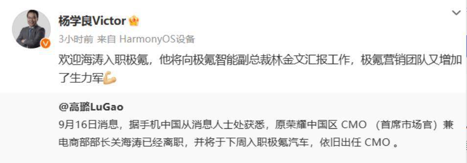网通社快讯近日,有媒体报道称,原荣耀中国区CMO兼电商部部长关海涛已经离职,并将于本周入职极氪汽车,依旧出任CMO。9月18日,吉利控股集团高级副总裁杨学良确认,关海涛已经入职极氪,将向极氪智能副总裁林金文汇报。
