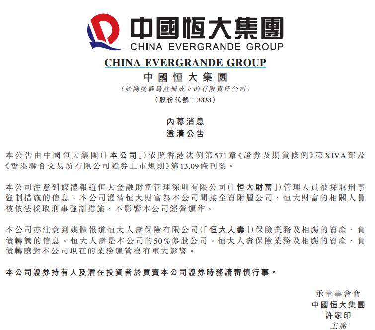 中新经纬9月18日电 中国恒大9月18日公告称,公司注意到媒体报道恒大财富管理人员被采取刑事强制措施的信息。中国恒大表示,恒大财富为本公司间接全资附属公司,恒大财富的相关人员被依法采取刑事强制措施,不影响本公司经营运作。