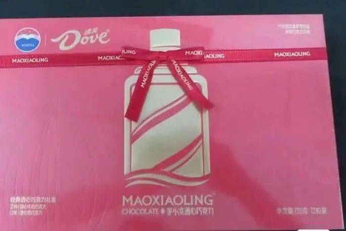 被曝光的照片显示,联名产品名称为“茅小凌酒心巧克力酒心巧克力礼盒”,其中经典酒心巧克力礼盒的外包装偏红色,印有茅台与德芙的logo,以及添加了丝带的酒瓶图案。
