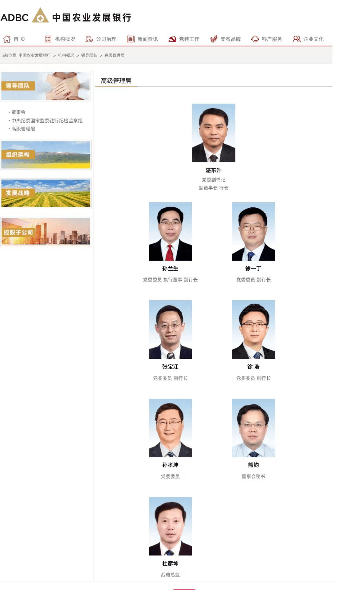 目前,农发行的高管团队共有8人,除孙孝坤外,还有党委副书记、副董事长、行长湛东升,党委委员、执行董事、副行长孙兰生,党委委员、副行长徐一丁,党委委员、副行长张宝江,党委委员、副行长徐浩,董事会秘书熊钧,战略总监杜彦坤。