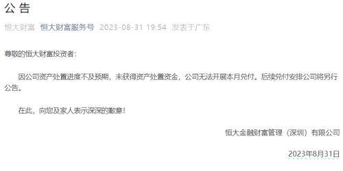 2023年8月31日,恒大财富发布公告称,因公司资产处置进度不及预期,未获得资产处置资金,公司无法开展本月兑付。后续兑付安排公司将另行公告。
