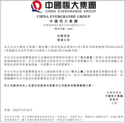中国恒大注意到媒体报道恒大金融财富管理深圳有限公司(“恒大财富”)管理人员被采取刑事强制措施的信息。中国恒大澄清,恒大财富为该公司间接全资附属公司,恒大财富的相关人员被依法采取刑事强制措施,不影响该公司经营运作。