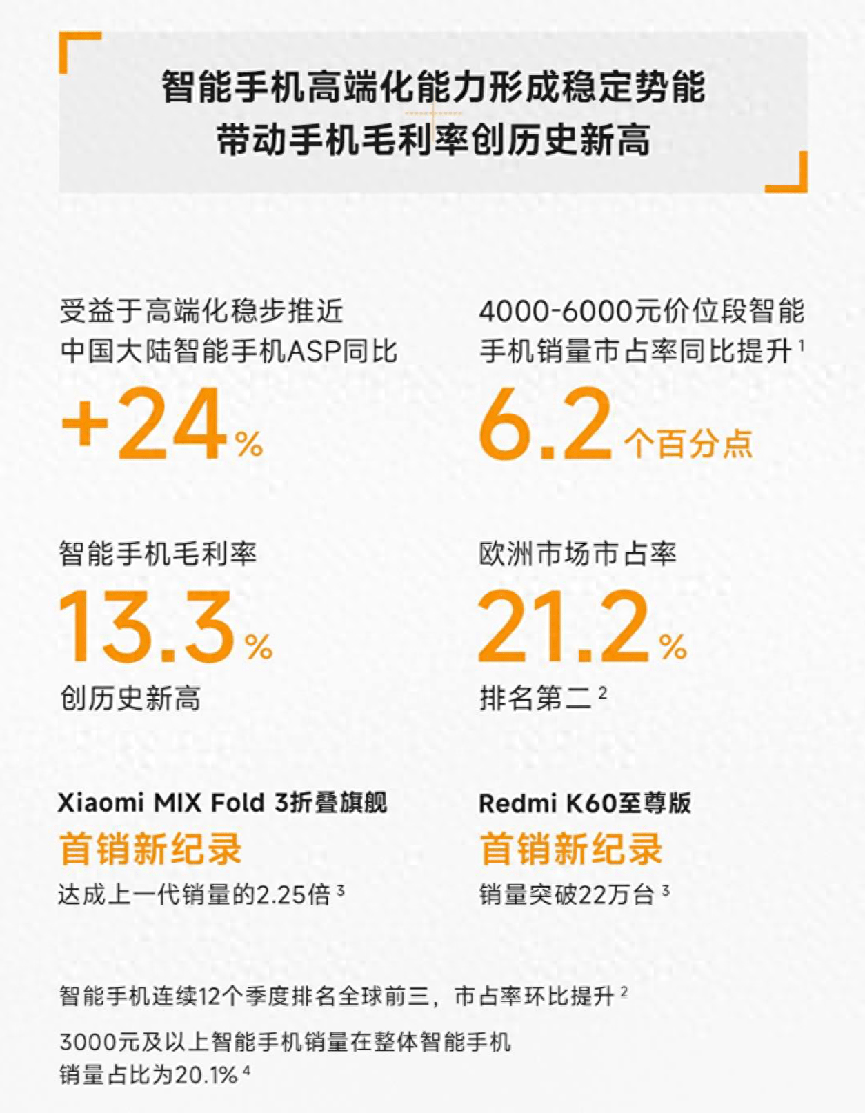 从这次小米季度财报来看,小米今年冲高已经是获得了一些成就,它的营收来到了674亿元,其中整体毛利率来到了21%,创造历史新高,能够在这低迷的手机市场之中还能破记录就已经说明了很多问题了,且刚发布没多久的MIX Fold3的销量在短短几个月之内就已经是上一代销量的2.25倍,看来大家还是口嫌体正直,嘴上说不好但早早就行动起来了。