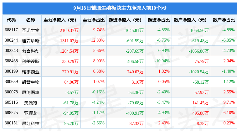 9月18日辅助生殖板块较上一交易日上涨0.92%,圣诺生物领涨。当日上证指数报收于3125.93,上涨0.26%。深证成指报收于10200.04,上涨0.55%。辅助生殖板块个股涨跌见下表: