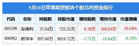 北向资金方面,当日苹果期货板块北向资金持股市值为1.05亿元,增持142.05万元。其中增持最多的是安德利,增持了160.69万元。减持持最多的是新洋丰,减持了18.64万元。苹果期货板块北向资金持股变动明细见下表: