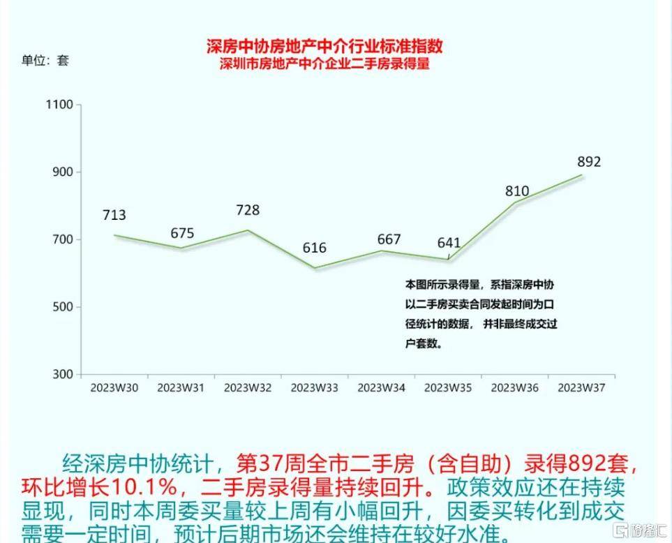 目前根据深圳市房地产中介协会跑得最快的市场数据来看,近两周(第37周、38周)二手房录得量都表现出加速回升。如果这个增速能持续一到两个月,说明市场信心有明显修复,便能够间接给真实的成交市场带来积极的恢复预期。