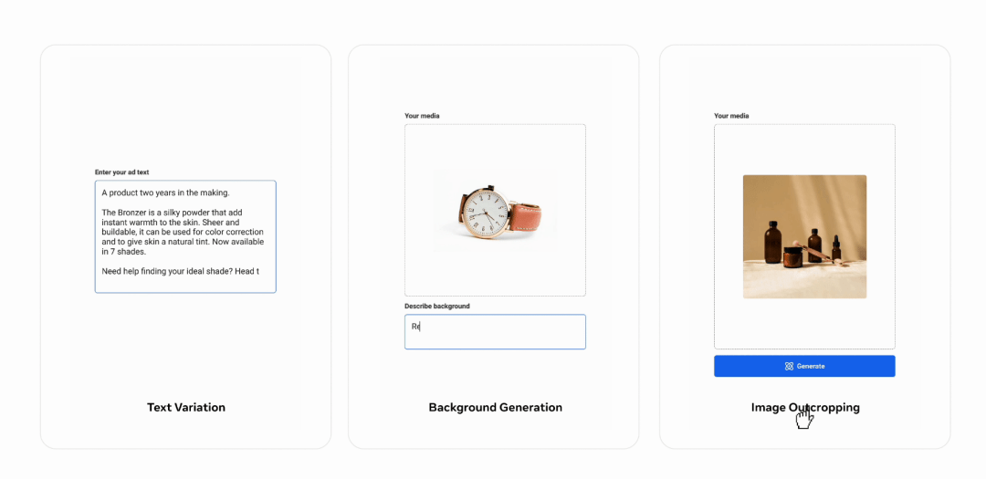 聚焦在内容智能化生成是水到渠成的,因为生成式AI其核心就是从已有数据中学习,进而生成新的原创内容或产品。目前,谷歌、亚马逊、Meta等海外大厂几乎都已有相关的产品或工具,主要功能是通过生成式AI来生成文本、图像、3D、视频等多种形式的内容,帮助广告创意生产方优化创作、提高效率。