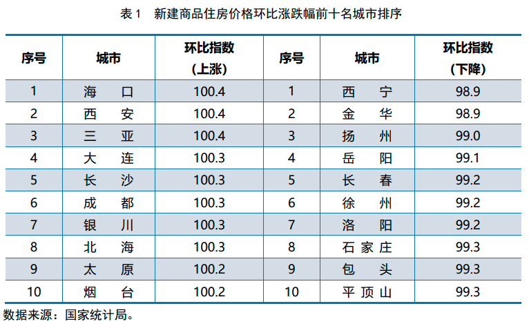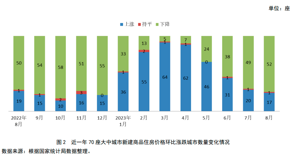 70座大中城市新建商品住宅价格环比上涨的城市17座,较上月减少3座;持平的城市1座;下降的城市52座,较上月增加3座。价格环比上涨的城市中,海口、西安、三亚涨幅居前,上涨0.4%,其次大连、长沙、成都等5座城市上涨0.3%,其他城市涨幅均在0.2%及以下。价格环比下降的城市中,跌幅最大的西宁、金华下降1.1%,其次扬州下降1.0%,其他城市跌幅在0.9%及以下。