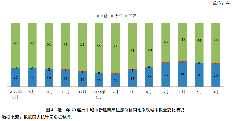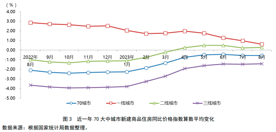 8月70座大中城市新建商品住房价格同比下降0.52%,跌幅较上月缩小0.02个百分点。一线城市价格同比保持上涨,平均涨幅为0.63%,较上月收窄0.34个百分点;二线城市平均涨幅为0.27%,较上月扩大0.03个百分点;三线城市同比下降1.41%,跌幅较上月缩小0.04个百分点。