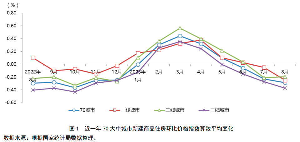 8月70座大中城市新建商品住宅价格环比平均下降0.29%,较上月扩大0.06个百分点。一线城市平均下降0.25%,跌幅较上月扩大0.2个百分点;二线城市平均下降0.19%,较上月缩小0.03个百分点;三线城市下降0.37%,较上月扩大0.1个百分点。