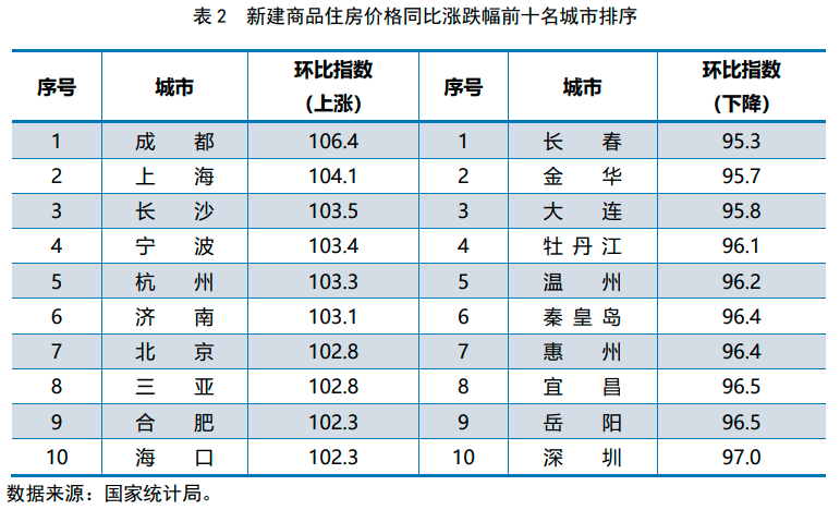 同比上涨的3座城市中,成都以4.1%涨幅居首,北京和长沙均上涨0.8%。三亚与去年同期持平。同比下降的城市有66座,其中吉林跌幅居首,下降7.4%,其次牡丹江、丹东分别下降6.8%、6.2%,其他城市跌幅均在5.8%及以下。