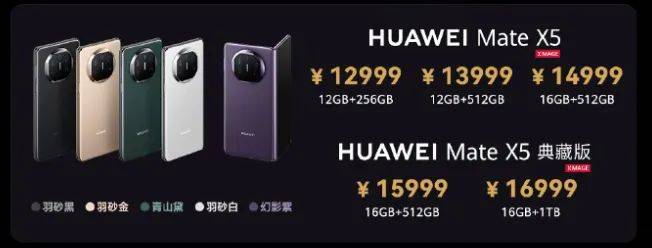 9月14日10:08,华为全新折叠旗舰华为Mate X5正式开售,价格也首次公布,其中12GB+256GB售价12999元;12GB+512GB售价13999元;16GB+512GB售价14999元;16GB+512GB典藏版售价15999元;16GB+1TB典藏版售价16999元。