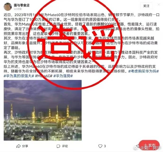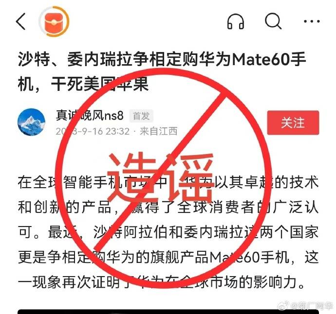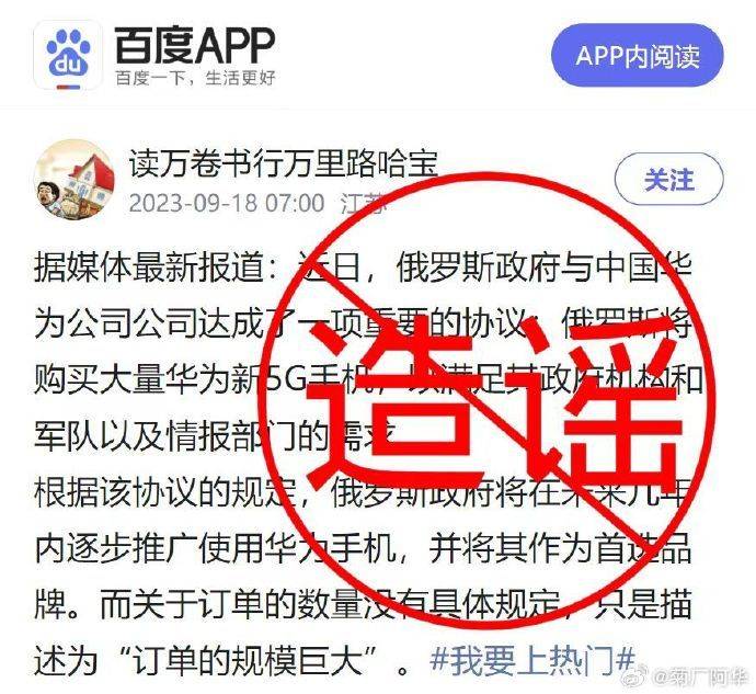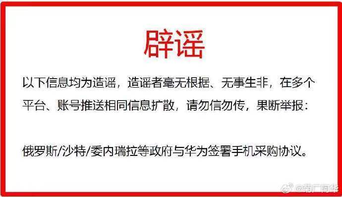 9月18日深夜,华为通过微博官方蓝V账号“菊厂阿华”辟谣。以下信息均为造谣,造谣者毫无根据,无事生非,在多个平台、账号推送相同信息扩散,请勿信勿传,果断举报: