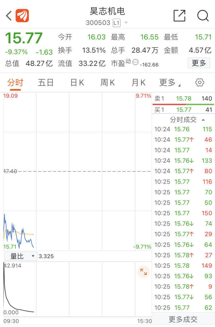 9月19日,昊志机电(300503)现跌9%,报15.77元/股,总市值跌破50亿元。