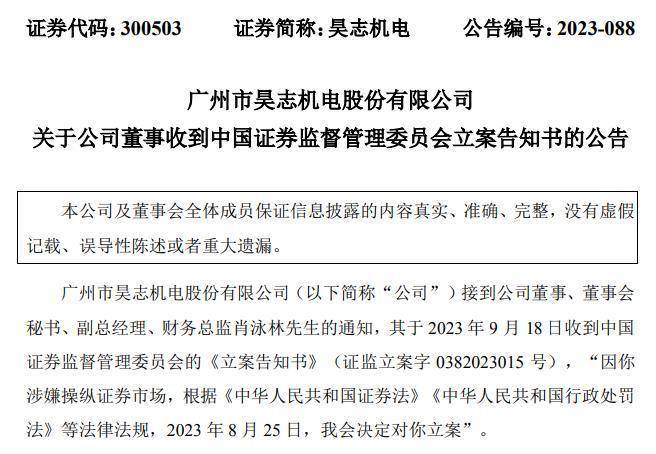 昊志机电9月18日晚间公告,公司接到公司董事、董事会秘书、副总经理、财务总监肖泳林的通知,其于2023年9月18日收到中国证券监督管理委员会的《立案告知书》。