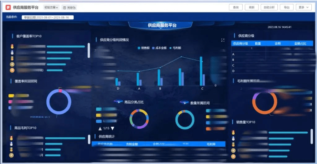 通过供应商服务平台可在大屏上直观的看到各供应商的贡献值,商品的排名数据以及商品占有率,通过销售服务大屏可以让总部实时跟踪各门店的销售情况,还可以更详细的了解到对应商品在区域内的销售数据,这更有利于我们整体决策经营。