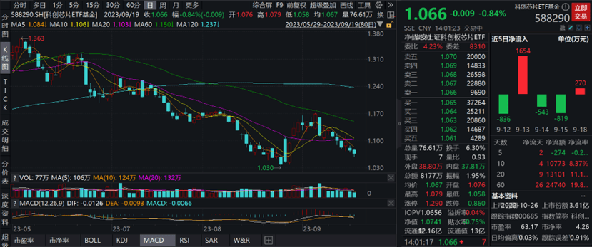 ETF方面,截至2023年14:01,科创芯片ETF基金(588290)震荡走低,现跌0.84%,成交额持续扩大,换手率达6.30%,市场交投活跃。