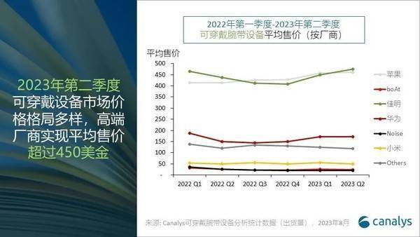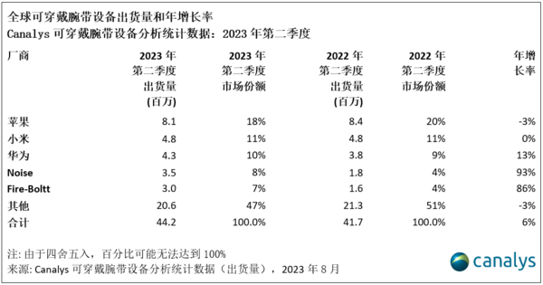 手表类别实现两位数增长,主要是由性价比较高的基础手表推动。Canalys表示,2023年第二季度,厂商推出一系列新品,以增强市场份额。例如,小米和华为推出了价格实惠的基础手环和手表,满足各类消费者的偏好。印度厂商也效仿而行,像Noise这样的品牌推出入门级型号,同时还推出多种价位段的产品,以满足更多的客户群。Fire Boltt进一步降价,以低于19美元的平均售价为消费者提供卓越的用户体验。