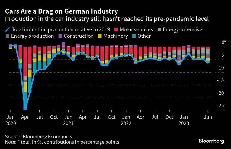 “德国汽车工业与制造业和服务业的其他部门紧密相连。目前,汽车生产仍未达到疫情前的水平,这是导致德国工业部门持续疲软的一个重要因素。”彭博经济(Bloomberg Economics)经济学家马丁·阿德默(Martin Ademmer)说。