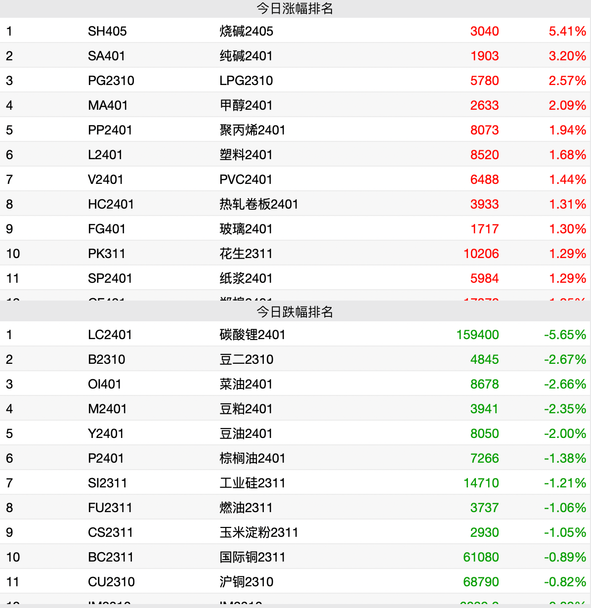 9月19日消息,商品期货收盘涨跌各半,烧碱涨超5%,纯碱涨超3%,液化石油气、甲醇涨超2%;碳酸锂跌超5%,豆二、豆粕、菜油、豆油跌超2%,棕榈油、工业硅、燃油等跌超1%。