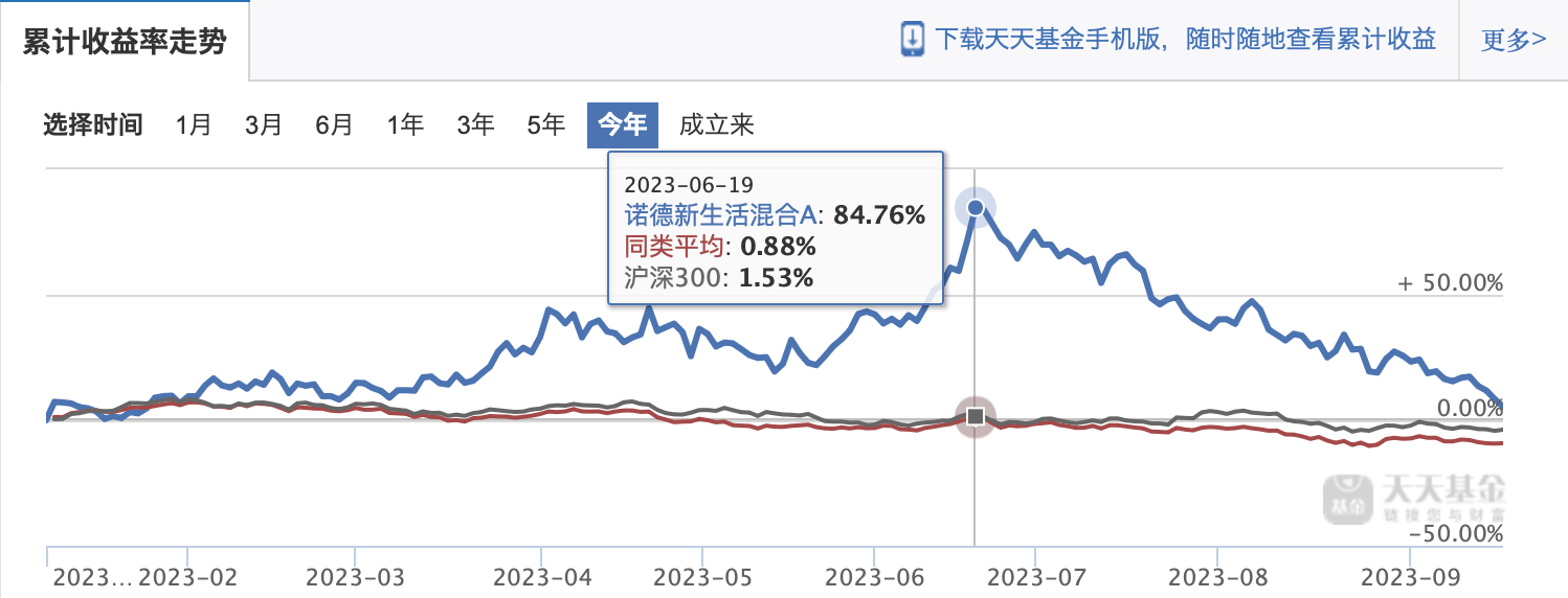 诺德基金或许“盛产”交易型选手,另一只是由周建胜管理的诺德新生活,今年上半年曾经排名很靠前,年内收益一度超过80%。
