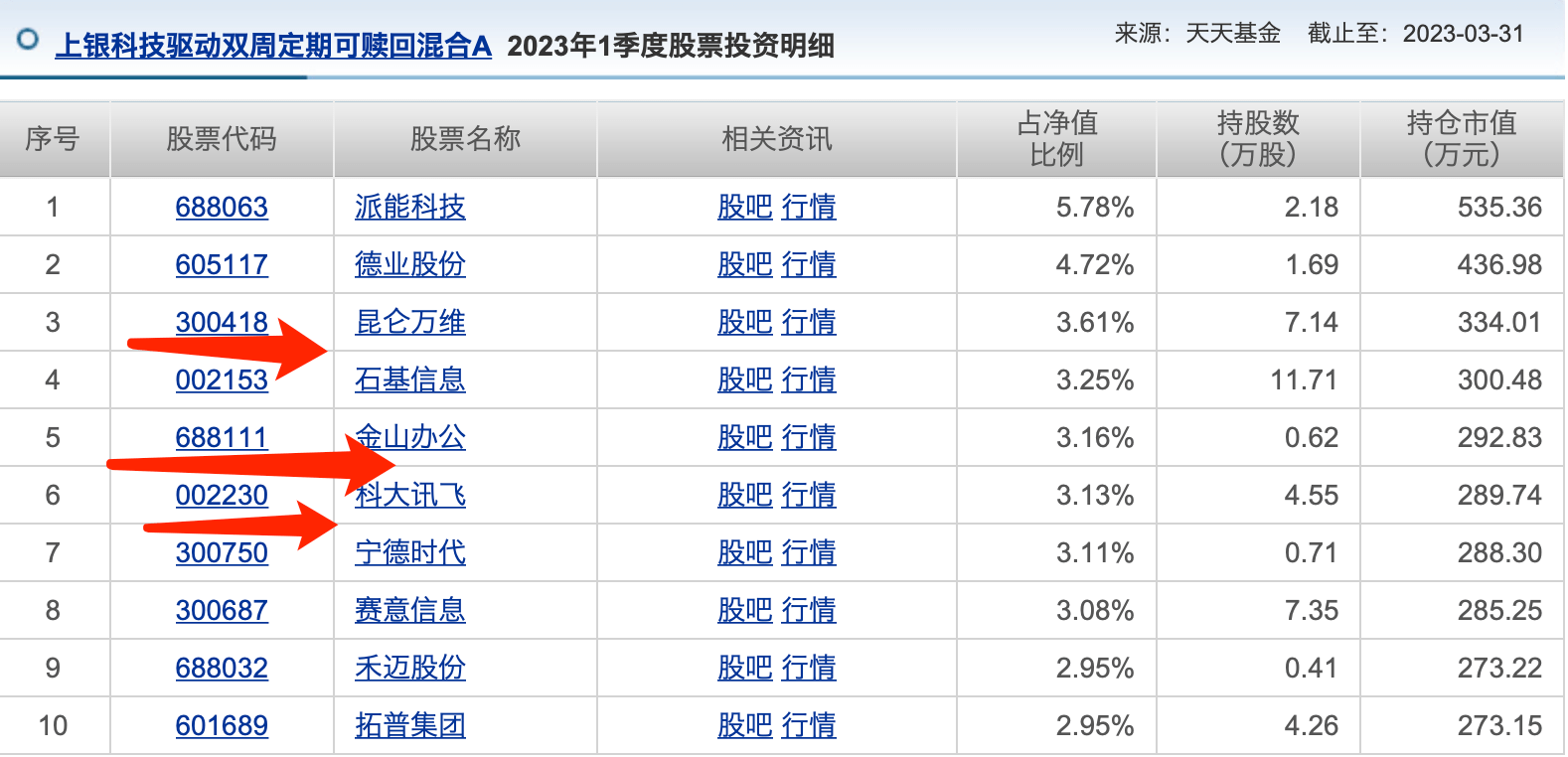 或许有人说,上银科技驱动一定是二季度才高位追进AI概念股的吧?其实不然,今年一季报显示,该产品就已经重仓了昆仑万维、金山办公、科大讯飞。