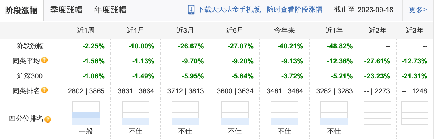 截至9月18日,该产品净值已经跌到0.3553元,成立以来亏损64.47%,近2年亏损64.26%,而今年以来,该产品也亏损高达37.12%。不论从各个维度来看,该产品都排名倒数。