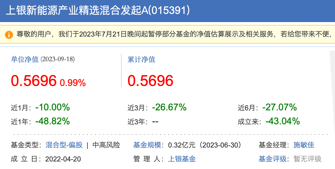 然而,上银新能源产业成立之后,也是不断亏损。截至9月18日,该产品净值跌到0.5696元,成立以来亏了43.04%,今年以来亏损40.21%,也是排名倒数。