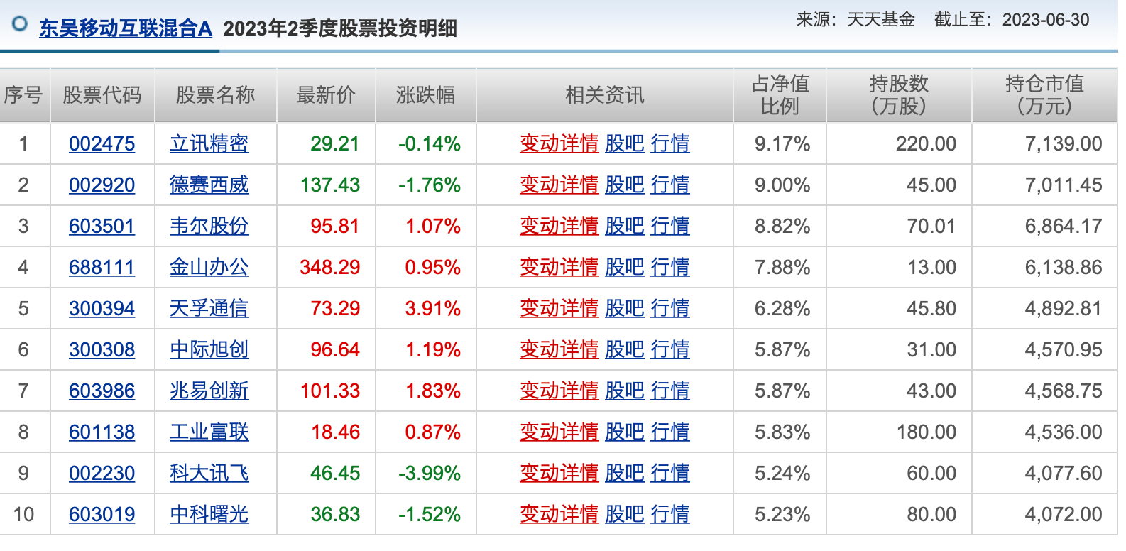 而东吴移动互联中报重仓股,也有金山办公、中际旭创、科大讯飞。十只重仓股,有三只都重叠。