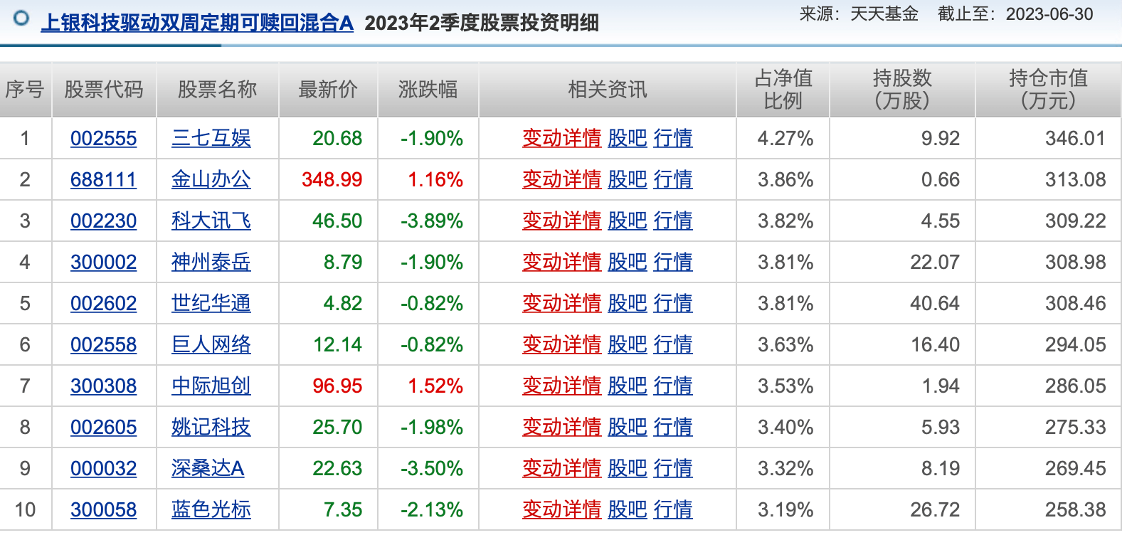 先说上银科技驱动,中报披露的持仓来看,不少都是今年的牛股,而且大多都是AI概念的大牛股。比如金山办公、科大讯飞、中际旭创、深桑达A等。另外,三七互娱、巨人网络等游戏股,也在上半年走势很强。
