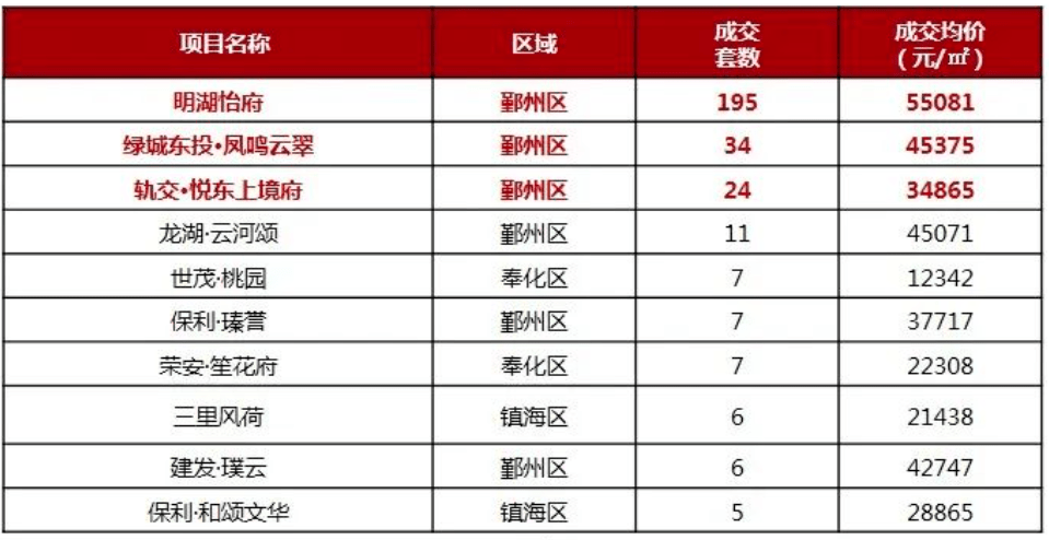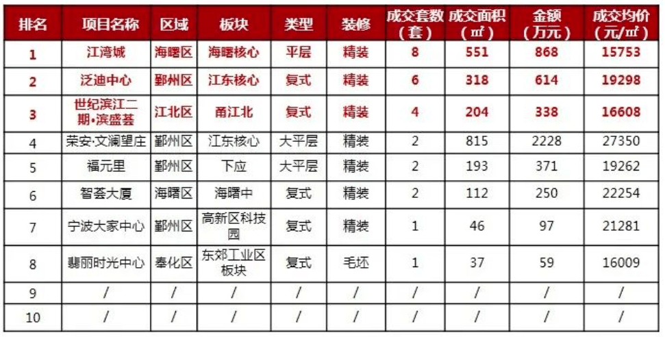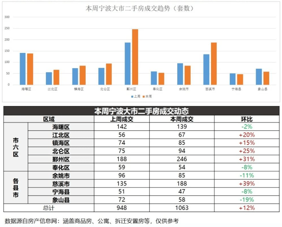 从上周宁波市六区住宅市场表现看,除镇海以外,其他五区成交套数均有不同幅度的上涨,成交量上鄞州区以296套保持周冠。