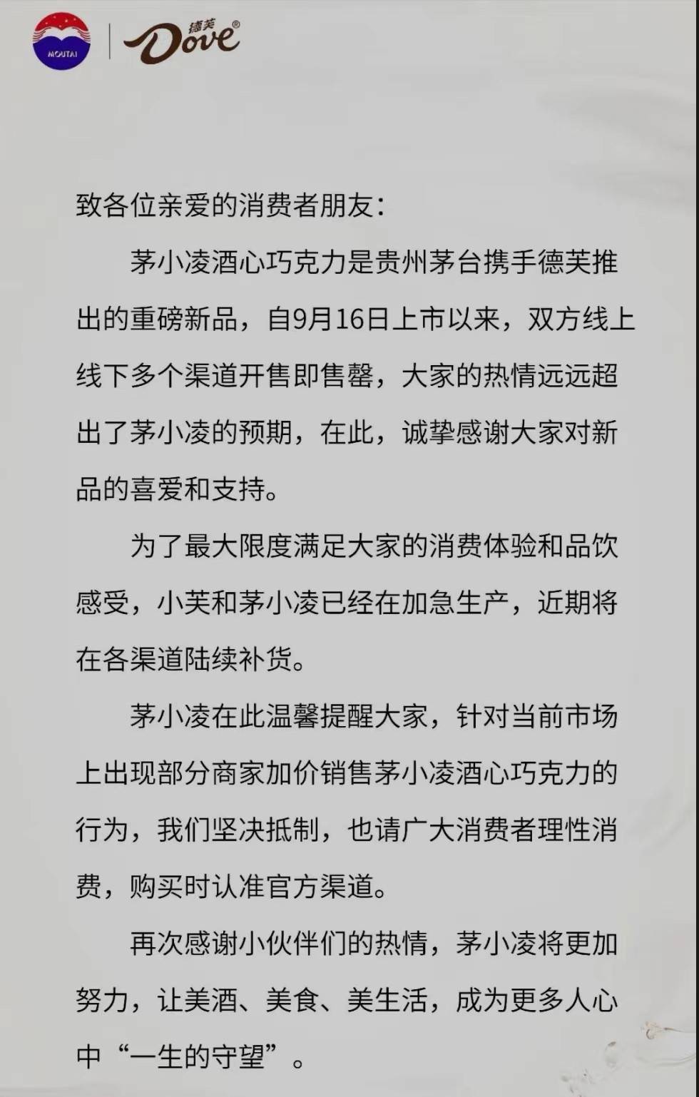 对此,茅小凌酒心巧克力称,针对当前市场上出现部分商家加价销售茅小凌酒心巧克力的行为,公司坚决抵制,也请广大消费者理性消费,购买时认准官方渠道。