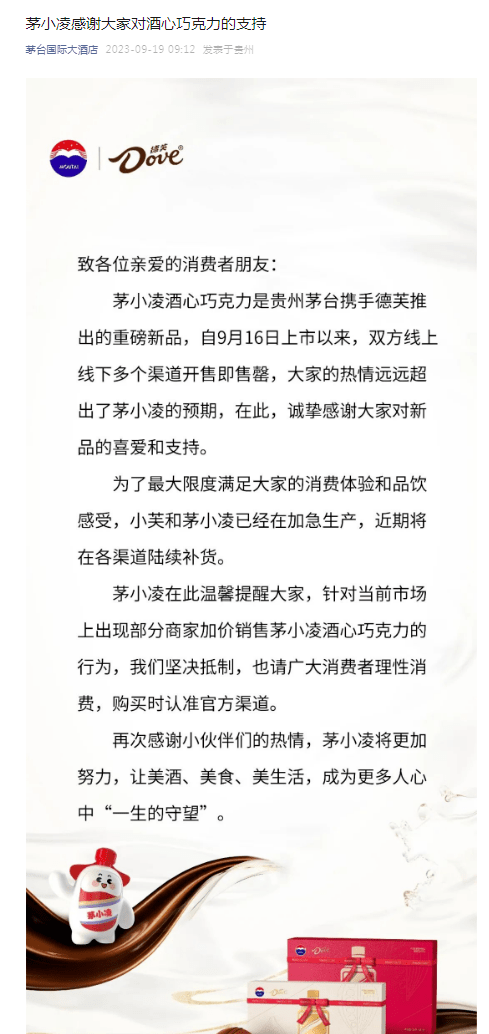 9月19日早间,针对近期茅小凌酒心巧克力在多个渠道开售即售罄的情况,认证主体为贵州茅台酒股份有限公司的茅台国际大酒店微信公众号发文表示,坚决抵制部分商家加价销售茅小凌酒心巧克力的行为,请广大消费者理性消费,购买时认准官方渠道。为了最大限度满足大家的消费体验和品饮感受,茅小凌酒心巧克力已经在加急生产,近期将在各渠道陆续补货。